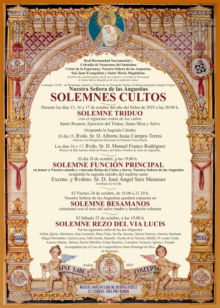 El día 18 de octubre, a las 19:00 h. se celebrará SOLEMNE FUNCION PRINCIPAL en honor a Nuestra amada y venerada Reina de Cielos y tierra, Nuestra Señora de las Angustias ocupando la sagrada cátedra del Espíritu Santo el Excmo. y Rvdmo. Sr. D. Jose Ángel Saiz Meneses, Arzobispo de Sevilla.