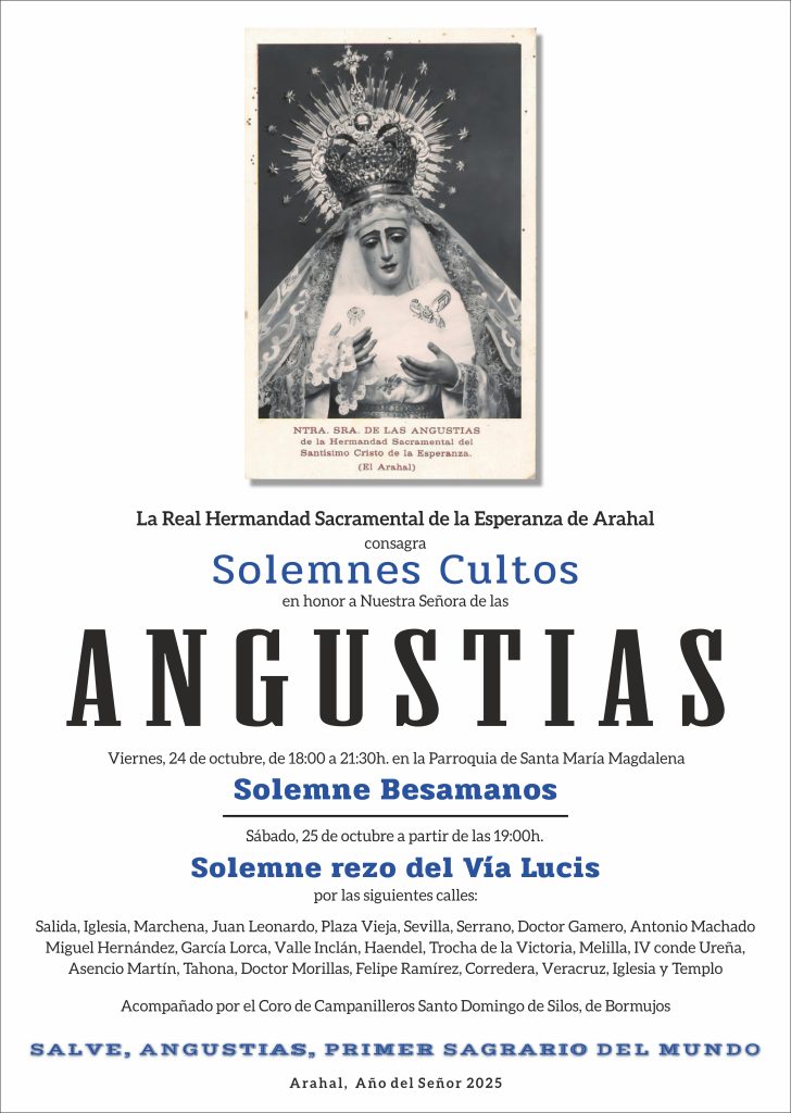 Nuestra Hermandad consagra -D.M.- en homenaje, honor y gloria de su Amada Titular, la Bienaventurada siempre Virgen Nuestra Señora de las Angustias, durante los días 15, 16 y 17 de octubre del año del Señor de 2025 a las 20:00 h.