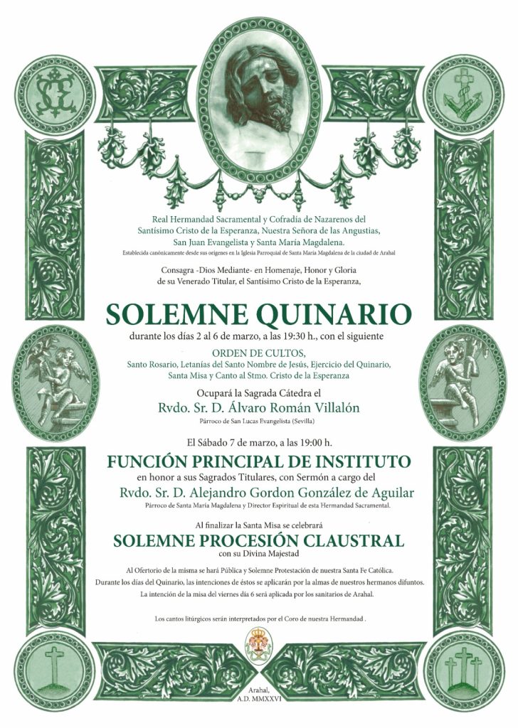 Dando cumplimiento a las Santas Reglas que rigen nuestra Corporación, y en concreto en su artículo número 99, la Hermandad celebra Solemne Quinario dedicado a su Venerado Titular, el Santísimo Cristo de la Esperanza, a saber: